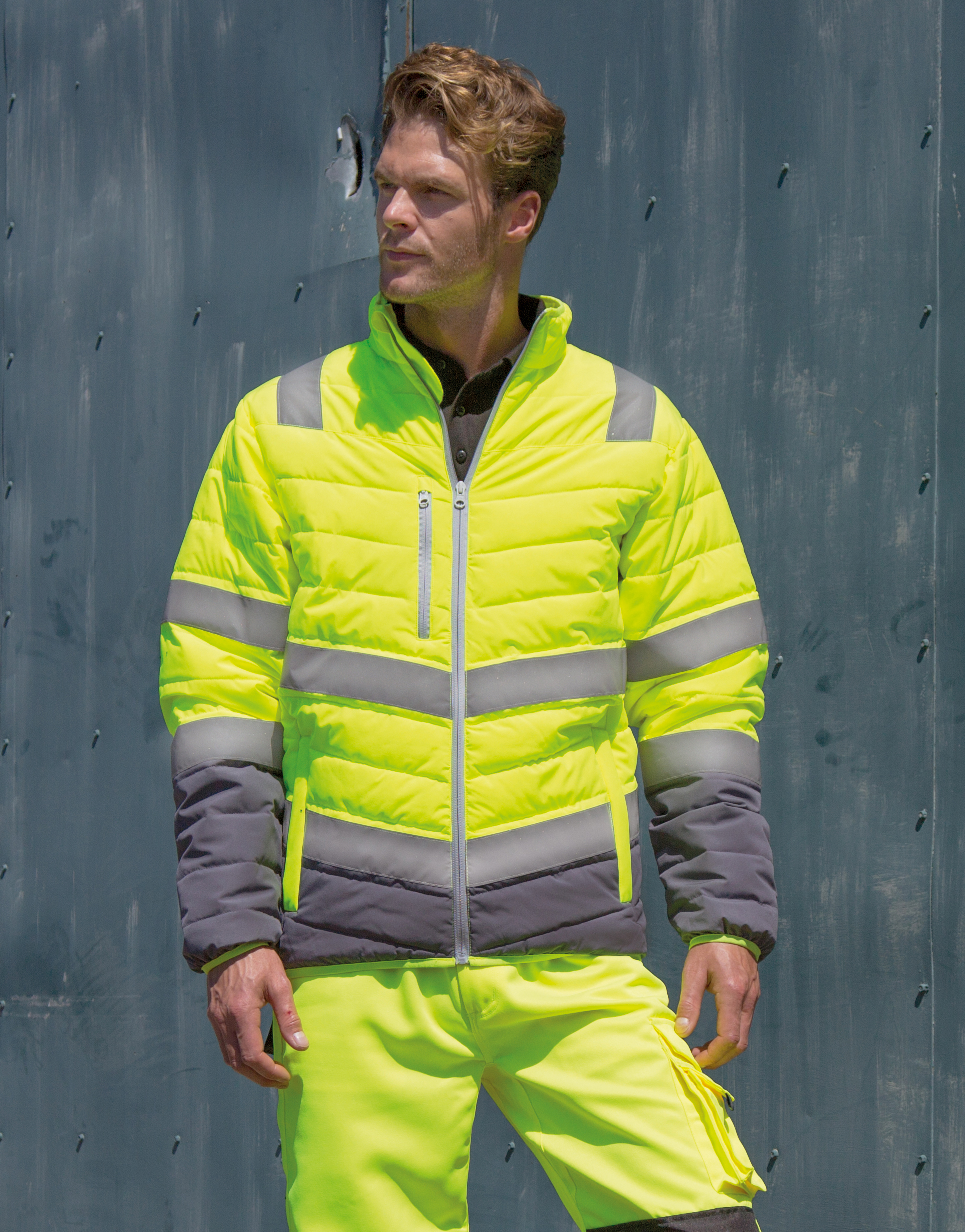 Kontrastni sivi umetci i unutarnja podstava daju jakni moderan izgled, dok ušivene reflektirajuće trake na ramenima, tijelu i rukavima jamče visoku vidljivost u svim uvjetima. Jakna je dostupna u klasama sigurnosti 2 i 3, ovisno o veličini, u skladu s međunarodnim standardima EN ISO 20471 i RIS-3279-TOM.