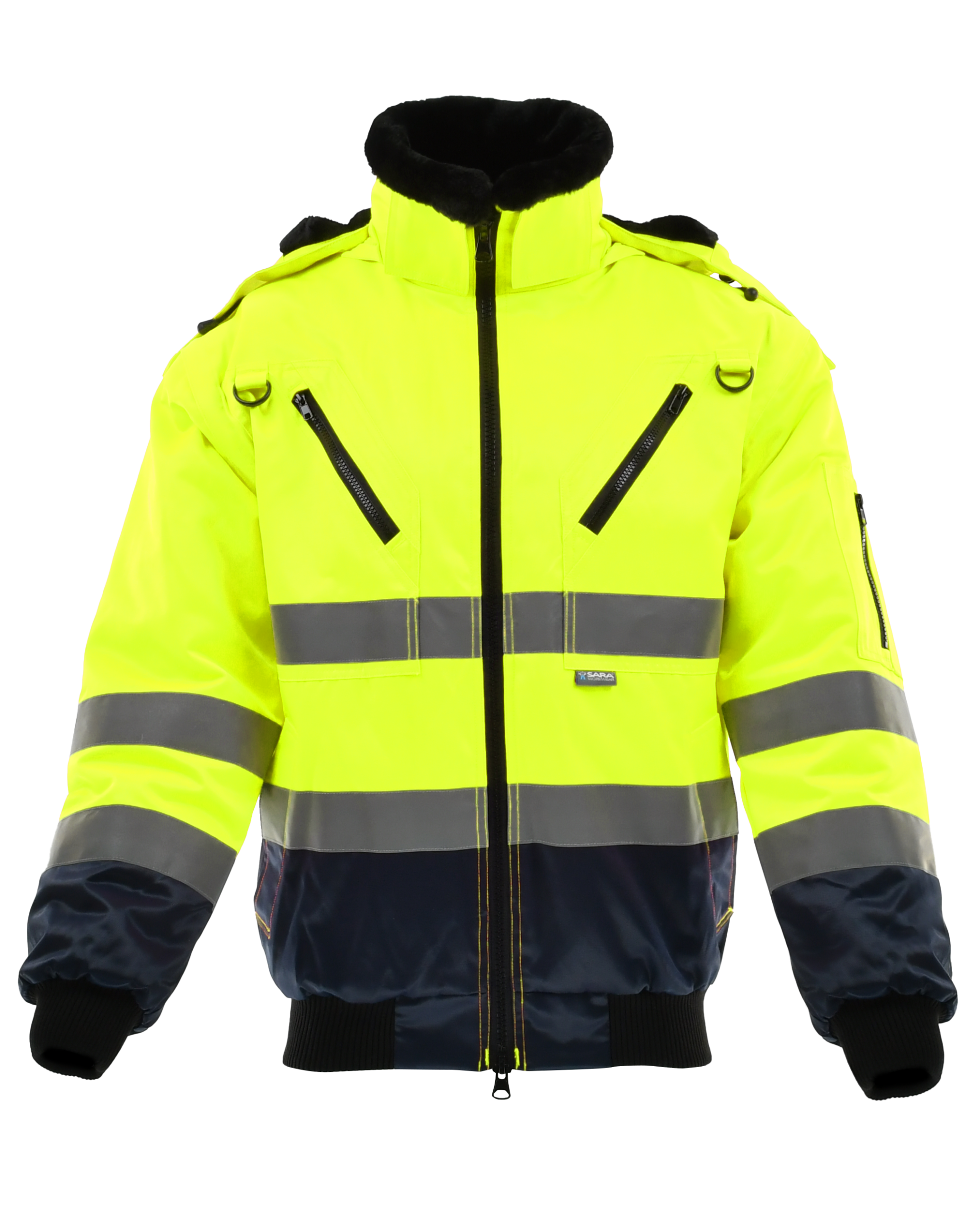 Podstavljena zimska jakna visoke vidljivosti s odvojivim rukavima, namijenjena radu u hladnim uvjetima.